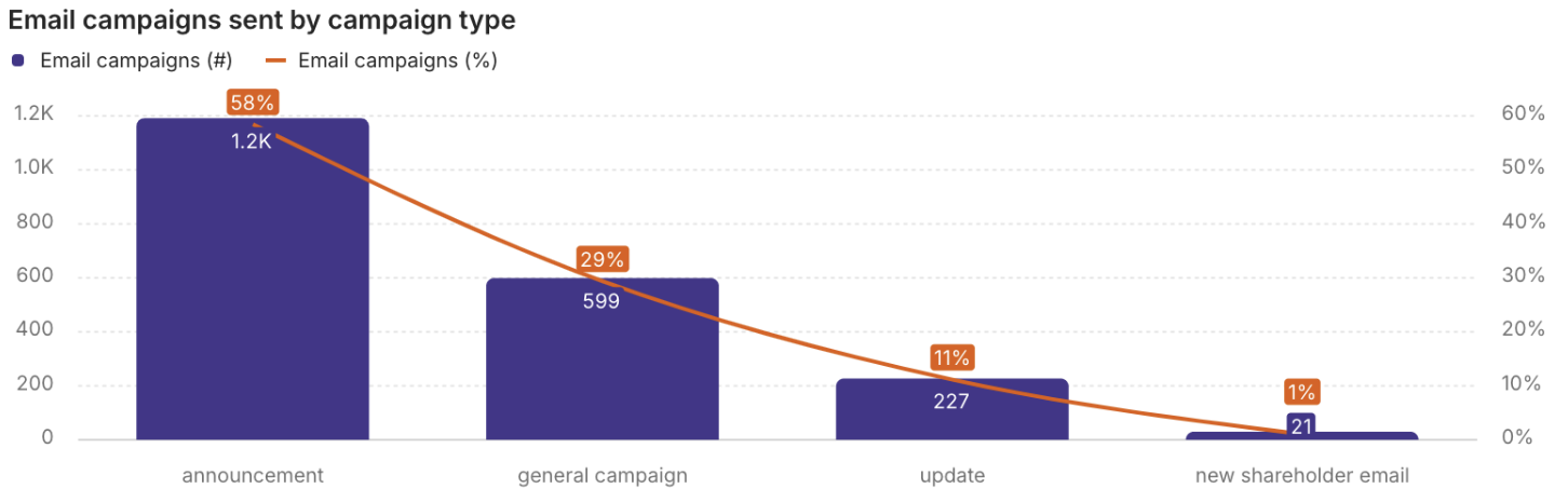 Over 50% of emails are used to send ASX announcements. You can also send "general campaigns" (which can be about anything), updates (e.g. webinars), and new shareholder welcome emails.