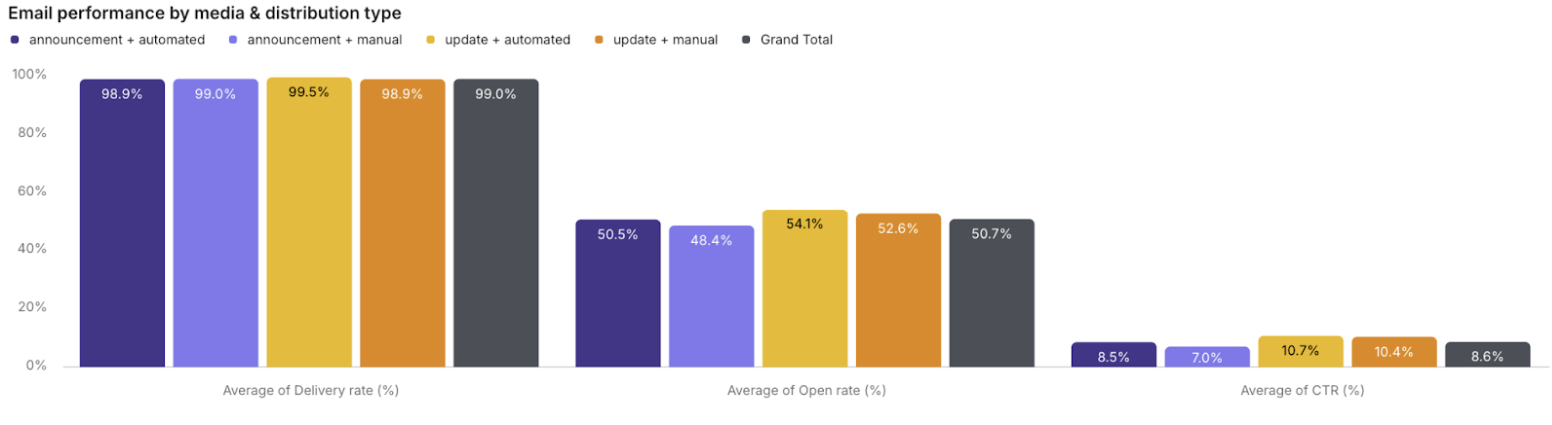 Amongst this group, it's almost a 50/50 split between manually sent campaigns and automatically distributed campaigns. As a reminder, you can set your announcements to be automatically sent to your investor hub users or you can discretely send each one manually: