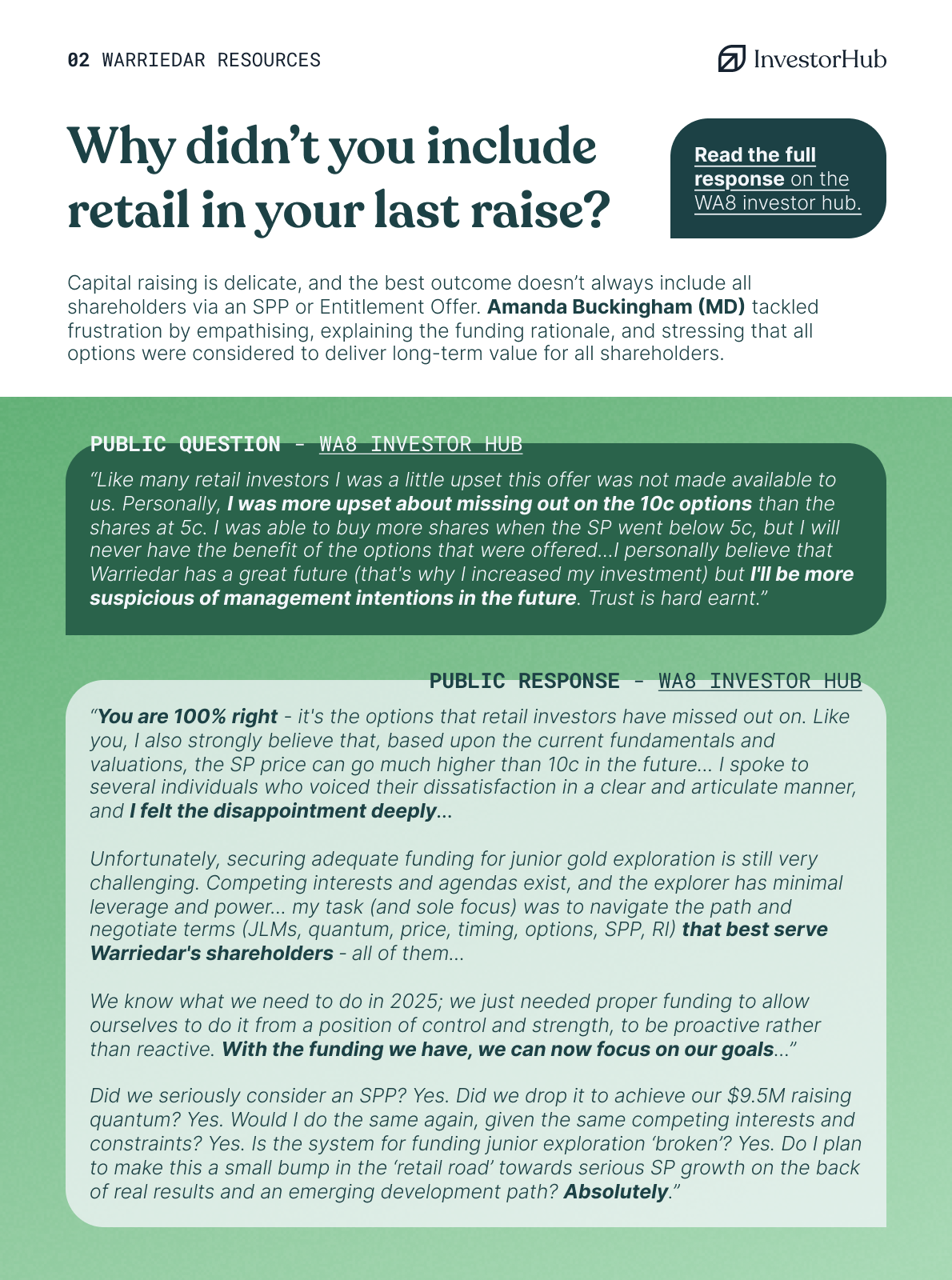 Warriedar Resources' Amanda Buckingham was asked this question by an investor who was not eligible for their capital raise. Amanda's response is exemplary and I encourage you to study it as an exercise in building investors' confidence in the company and the team.