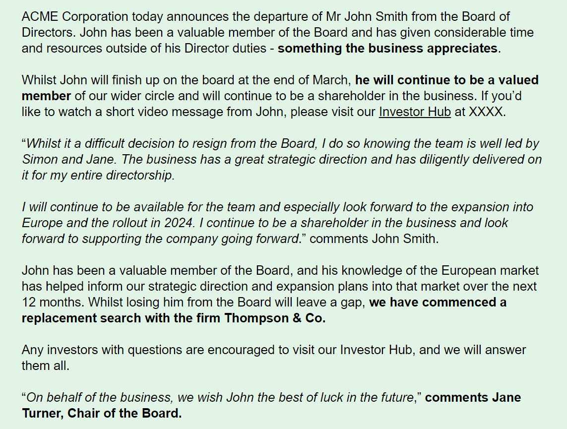 The amount of coverage they receive reflects the significance of board and C-level appointments. Paragraphs of content are written: background, why they’re a good fit, quotes from the Chairman, quotes from the appointee, etc. 🥰 “Let’s mark it as market sensitive” and “Can we get it into the media?” It’s all love and roses at the beginning.