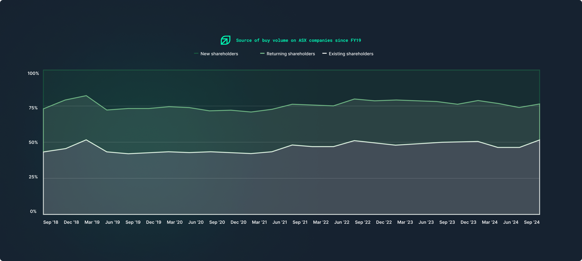 - 2021-2022: A marked shift occurred, with existing shareholders rising to consistently comprise over 50% of buying volume, while new shareholder contributions declined.